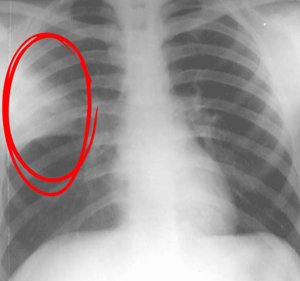 - Pe radiografie, apare o zonă albă bine delimitată, ceea ce indică un segment de plămân umplut cu lichid inflamator, unde aerul a fost înlocuit de secreții.