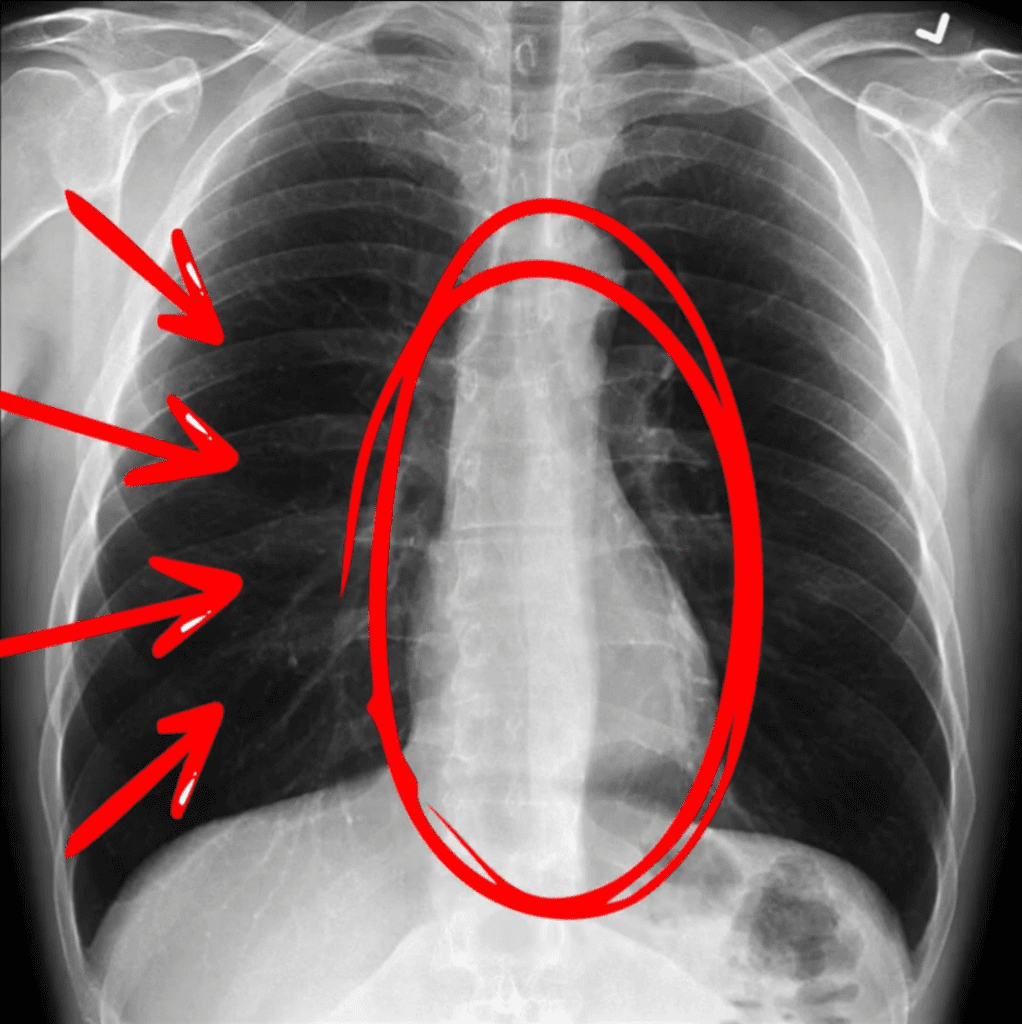 - Zonele negre reprezintă aerul din plămâni, ceea ce indică o funcționare normală a acestora ( săgețile roșii din imagine)